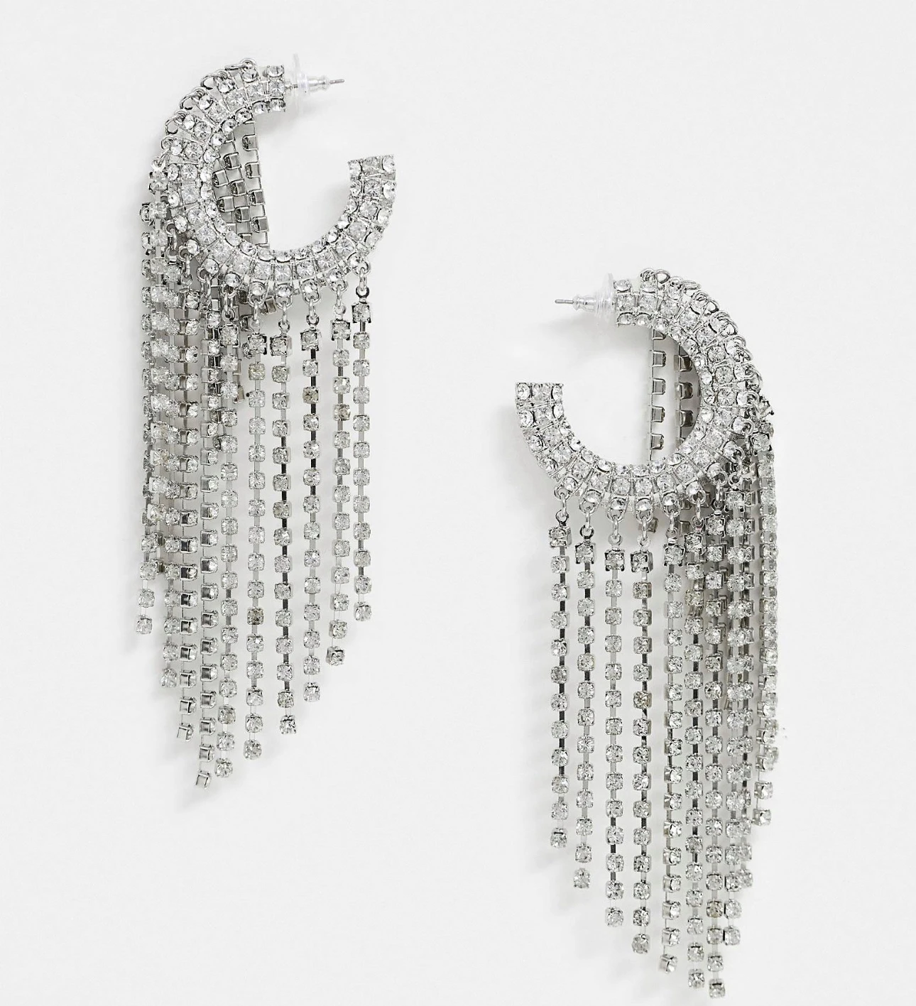 Earrings: ASOS DESIGN crystal drenched hoop earrings in silver tone.