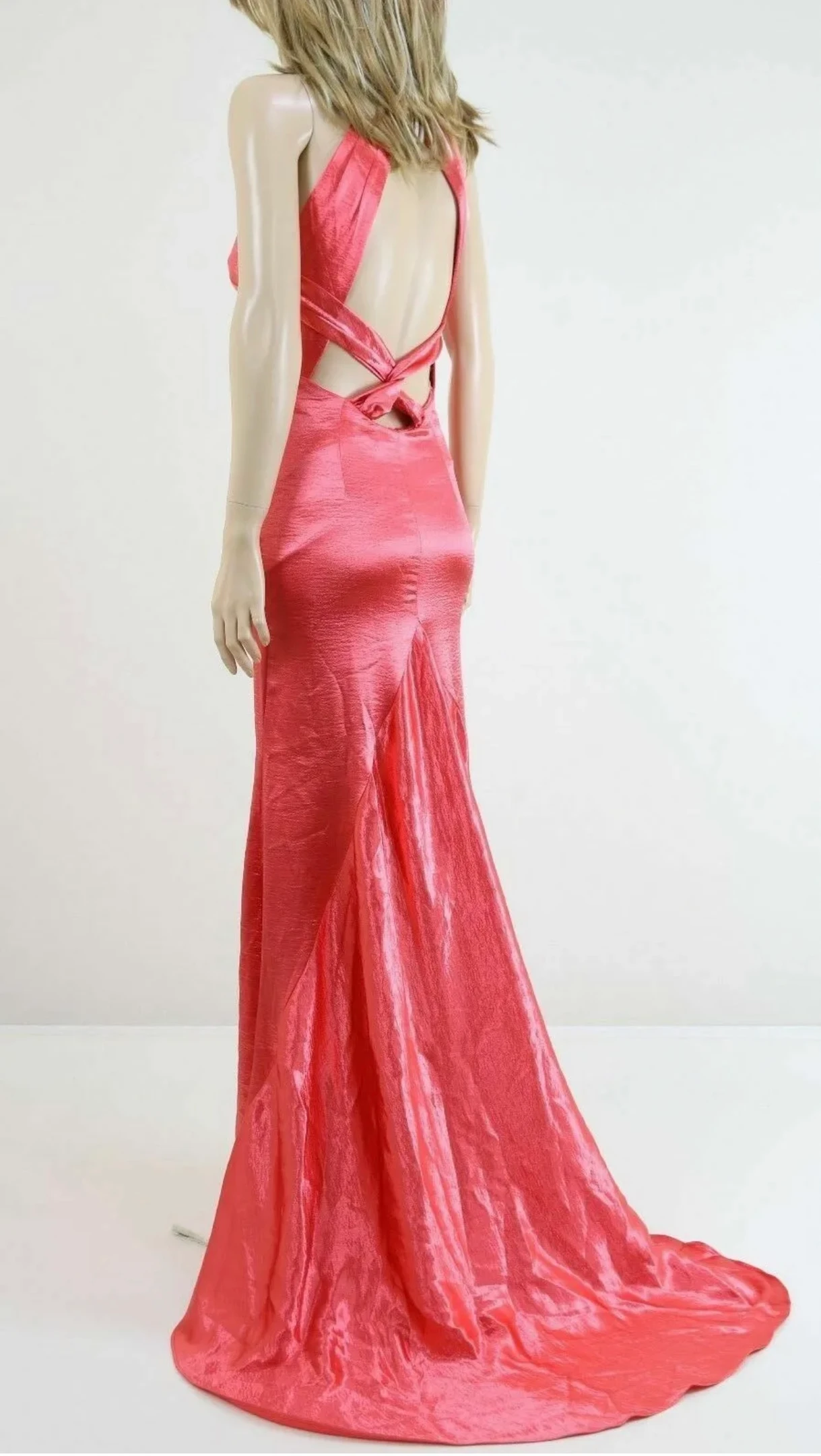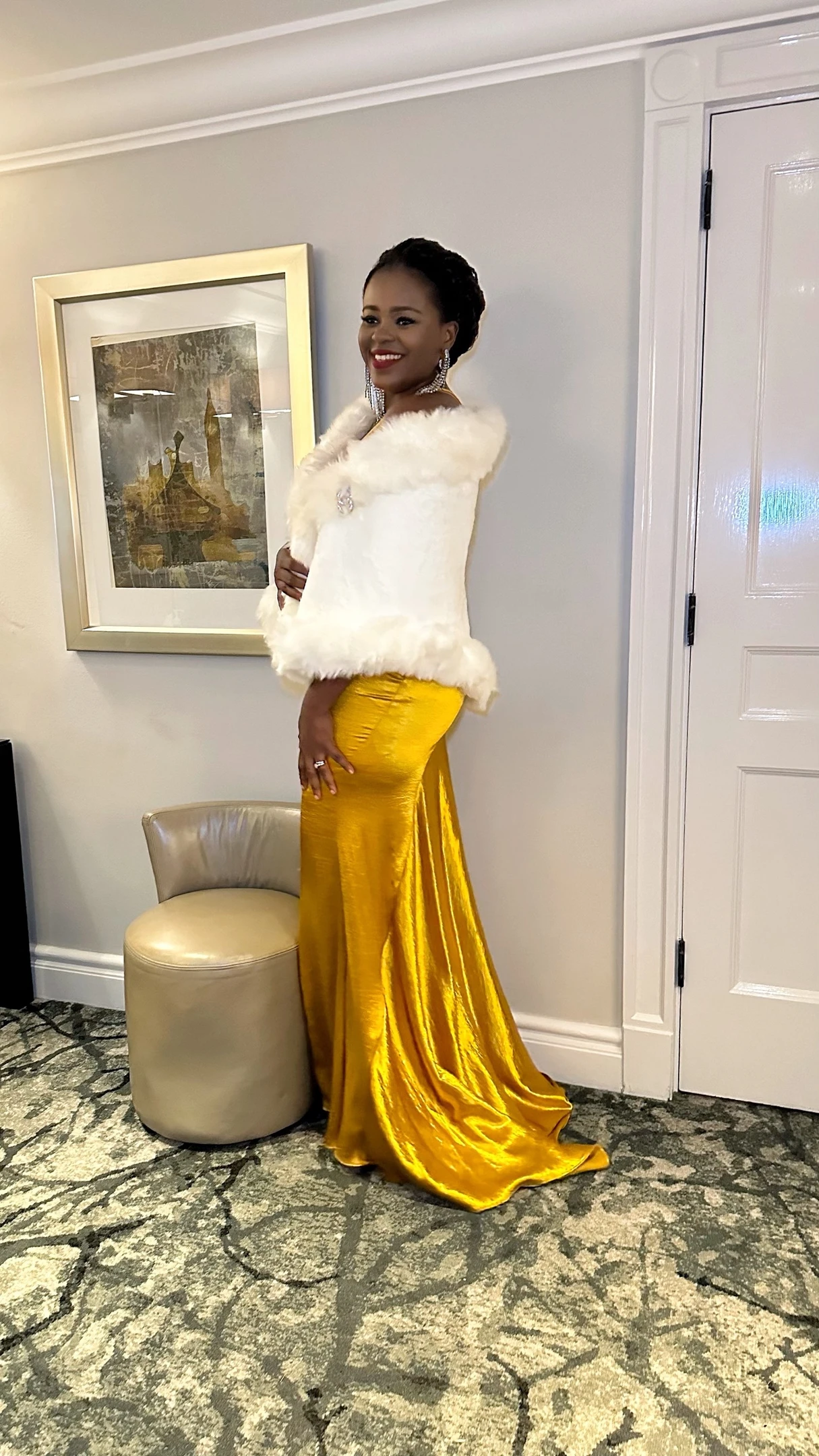 Dress: Jarlo Women’s Sasha High Neck Maxi Dress with Fishtail Train in colour mustard yellow.